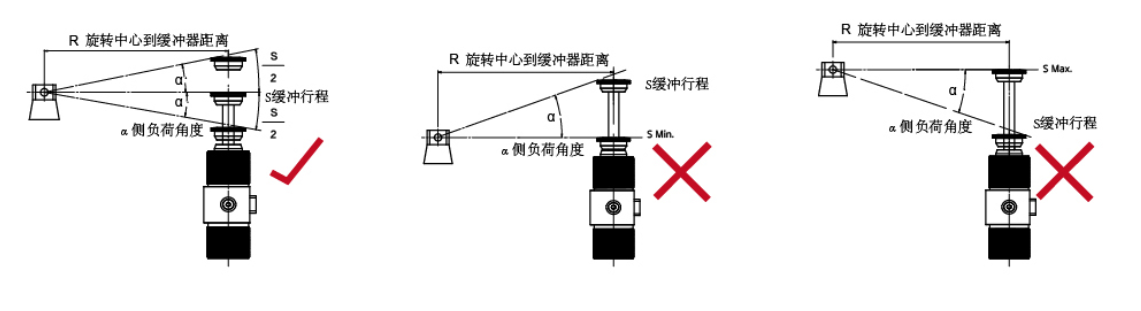 2) 按照下圖所示正確的方式安裝:當(dāng)緩沖行程壓縮到一半時, 應(yīng)無側(cè)向負(fù)荷;